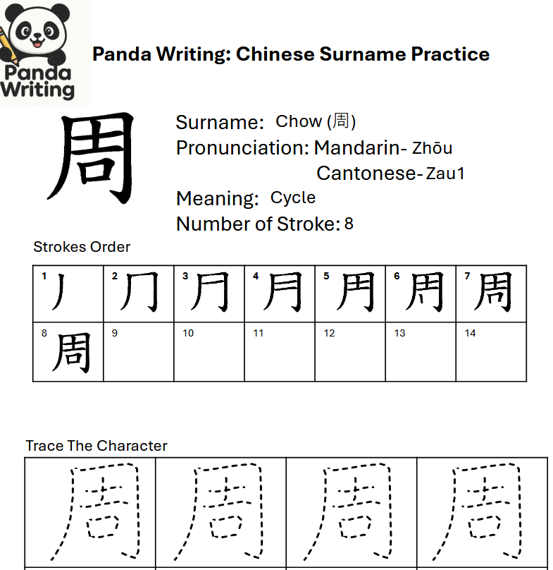 This Chinese surname Chow (周) tracing worksheet provides a free printable PDF to help children and beginners practice writing the character using guided tracing lines.