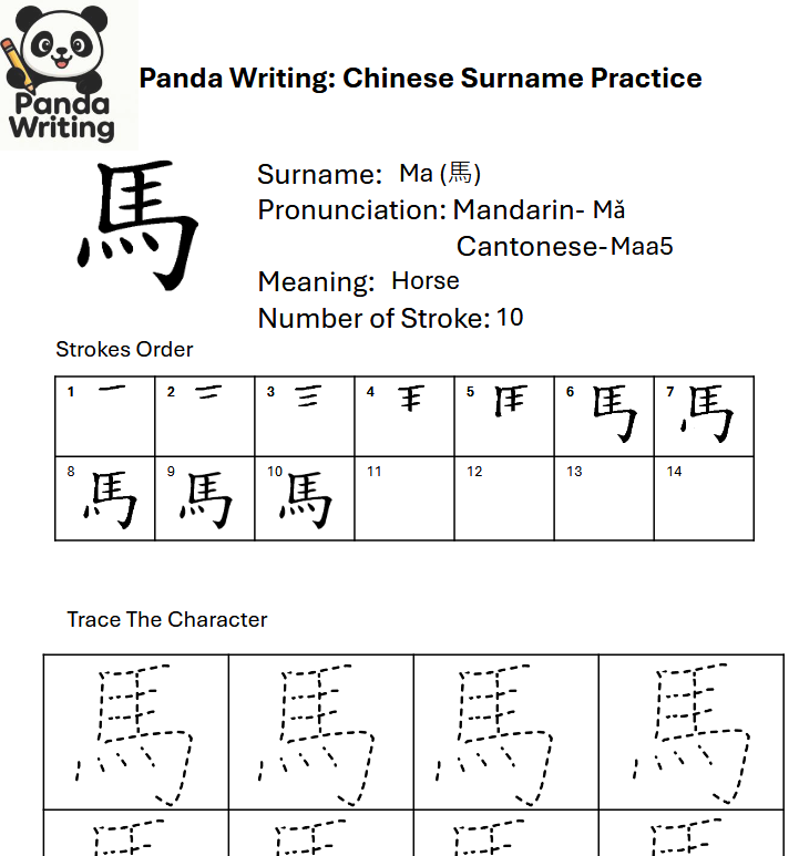 This Chinese surname Ma (馬) tracing worksheet provides a free printable PDF to help children and beginners practice writing the character using guided tracing lines.